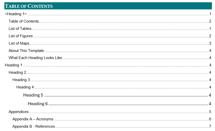 - Word Table of Contents (TOC) do not inherit fonts from Heading styles; they use their own. When displaying TOC headings deeper than three levels, the user may need to manually modify the font and size of the TOC elements to adhere to document styling. Select all rows in the TOC and change to Arial, size 10, with a line spacing of “Multiple” and 1.15.
